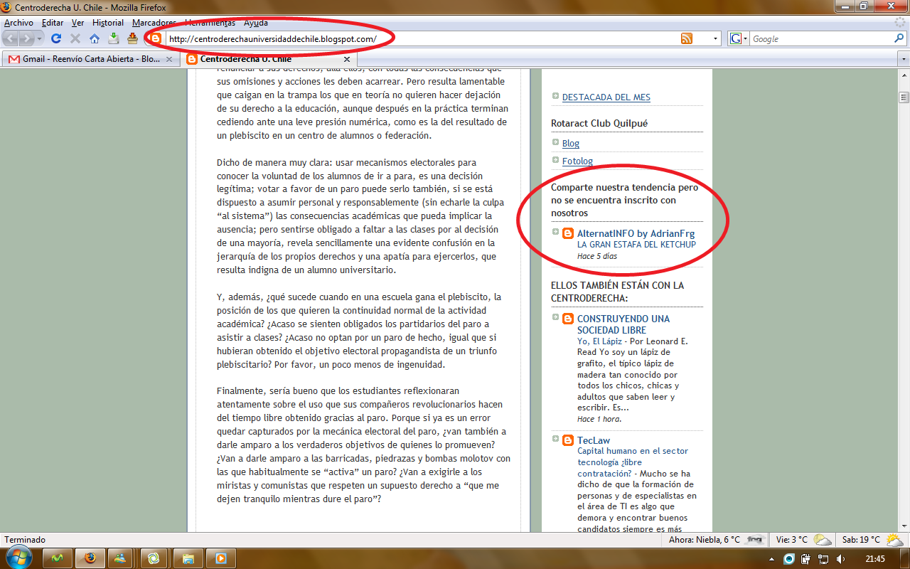 Al respecto, sólo podemos decir que en aquella sección linkeamos blogs que adhieren al sector y de ninguna forma pretendemos decir que sus dueños son “militantes” o que son adherentes de nosotros. Es por ello que la sección se titula “Ellos también están con la Centroderecha” y no "Ellos también están con la Centroderecha Universidad de Chile".